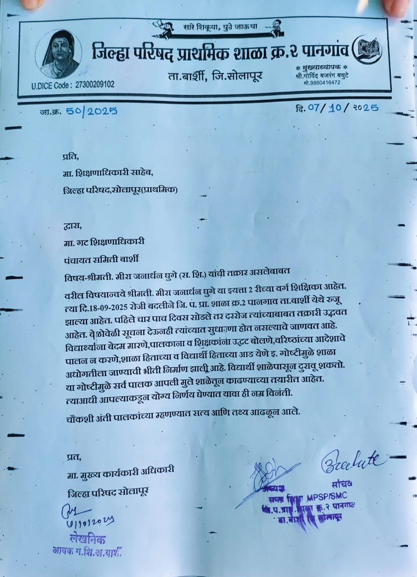 उपरोक्त विषयानुरूप आम्ही सर्व पाळकवर्ग (३. दुसरीचे विव्यार्थी) जि. प्र. प्राथमिक शात क्र. 2 पानगांव आपणास सविनय निवेदन तथापि लकार हार्ज करत आहोत की, मीमती मीरा घुगे या जि.प.प्राथमिक शाहा क्र. 2 येथे 5. दुलरीच्या कर्गावर काशिक्षक म्हणून कार्यरत आहेत.