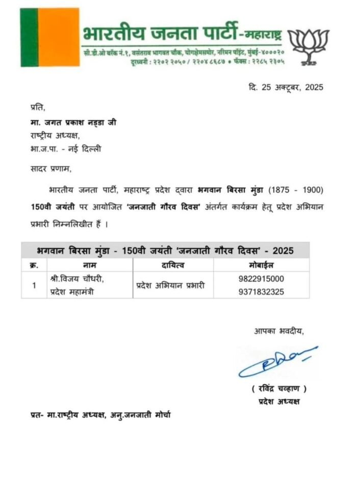 देशाचे यशस्वी नेतृत्व करणारे भारताचे प्रधानमंत्री श्री. नरेंद्र मोदीजी यांच्या मार्गदर्शनाखाली देशभरात जनजाती गौरव दिवस भव्यदिव्य स्वरूपात साजरा केला जात आहे, ही प्रत्येक भारतीयासाठी अभिमानाची बाब आहे.