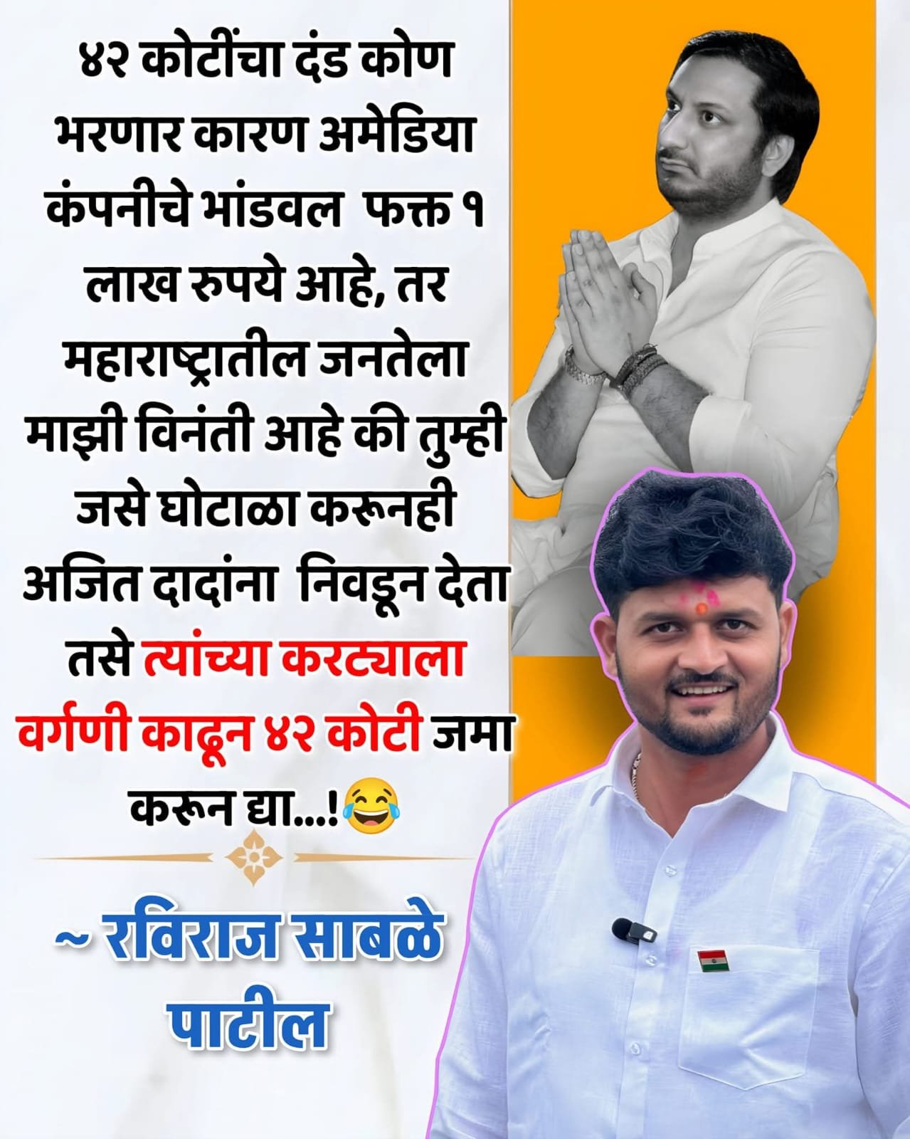 ४२ कोटींचा दंड कोण भरणार कारण अमेडिया कंपनीचे भांडवल आहे फक्त १ लाख रुपये, तर महाराष्ट्रातील जनतेला माझी विनंती आहे की तुम्ही जसे घोटाळा करूनही अजित दादांना निवडून देता तसे त्यांच्या मुलाला वर्गणी काढून ४२ कोटी जमा करून घ्या…!