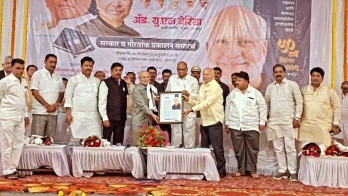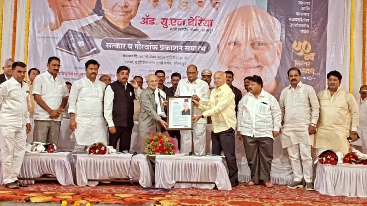 नागरी जनसेवे बरोबर सामाजिक, शैक्षणिक, सहकार, आणि कामगार चळवळीतील उल्लेखनीय सेवेचे ५० वर्षे निरंतर जनसेवा करणाऱ्या माजी महापौर अँड यु. एन. बेरिया यांचा सत्कार व गौरवांक प्रकाशन माजी केंद्रीय मंत्री शरद पवार, माजी केंद्रीय मंत्री सुशीलकुमार शिंदे, यांच्या हस्ते खासदार प्रणिती शिंदे, खासदार धैर्यशील मोहिते पाटील, काँग्रेसचे शहर अध्यक्ष चेतनभाऊ नरोटे, आमदार राजू खरे, आमदार नारायण आबा पाटील, आमदार अभिजित आबा पाटील, राष्ट्रवादीचे अध्यक्ष वसंत नाना देशमुख, माजी महापौर संजय हेमगड्डी, जनार्दन कारमपुरी, बाबा मिस्त्री, मनोज यलगुलवार आदींच्या प्रमुख उपस्थितीत करण्यात आला.
