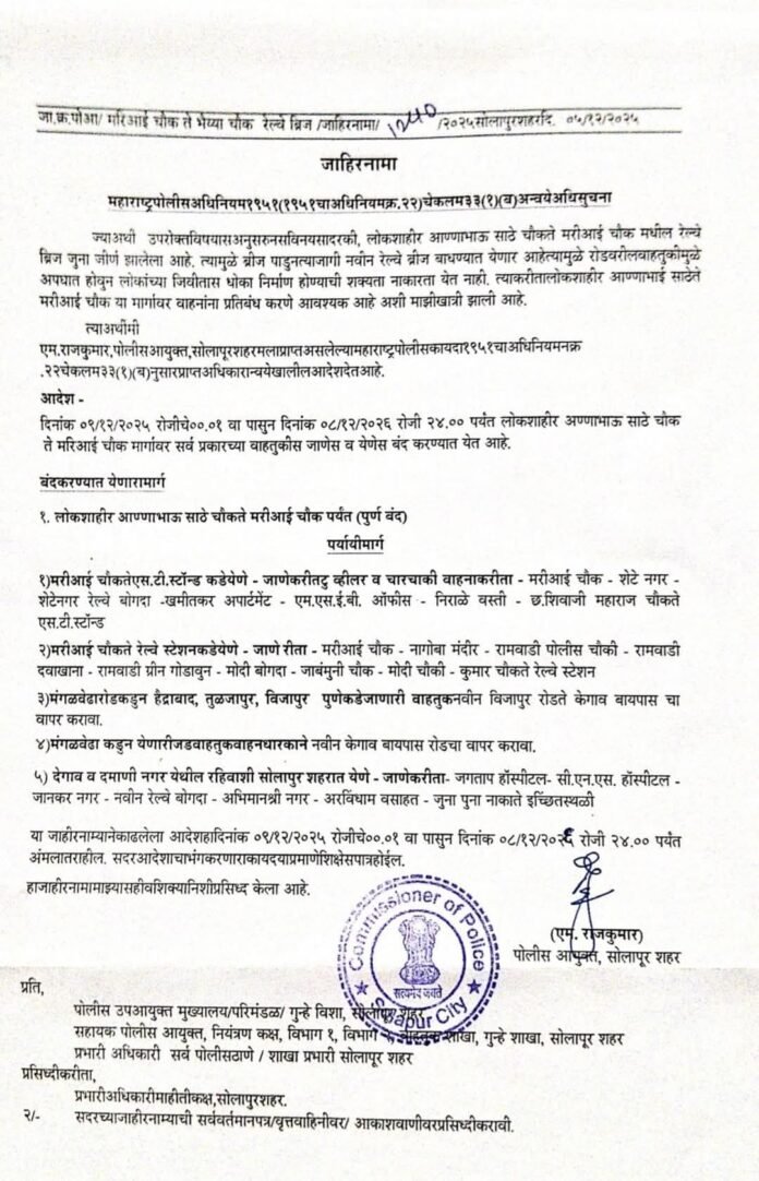 सोलापूर शहरातील पत्रकार भवन ते जुना विजापूर नाका या मार्गावर असलेला रेल्वे ब्रिज आठ आणि नऊ डिसेंबर रोजी दुपारी दोन ते रात्री आठ या दरम्यान वाहतुकीसाठी पूर्ण बंद राहणार.. ब्रिज जवळ महापालिका करणार पाईपलाईनचे काम – पोलीस आयुक्तांनी काढले आदेश