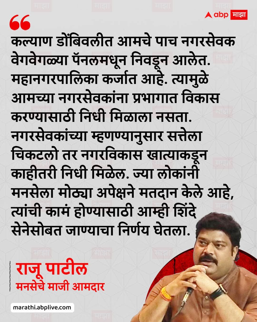 कल्याण डोंबिवलीत आमचे पाच नगरसेवक वेगवेगळ्या पॅनलमधून निवडून आलेत. महानगरपालिका कर्जात आहे. त्यामुळे आमच्या नगरसेवकांना प्रभागात विकास करण्यासाठी निधी मिळाला नसता. नगरसेवकांच्या म्हणण्यानुसार सत्तेला चिकटलो तर नगरविकास खात्याकडून काहीतरी निधी मिळेल. ज्या लोकांनी मनसेला मोठ्या अपेक्षने मतदान केले आहे, त्यांची कामं होण्यासाठी आम्ही शिंदे सेनेसोबत जाण्याचा निर्णय घेतला. -राजू पाटील