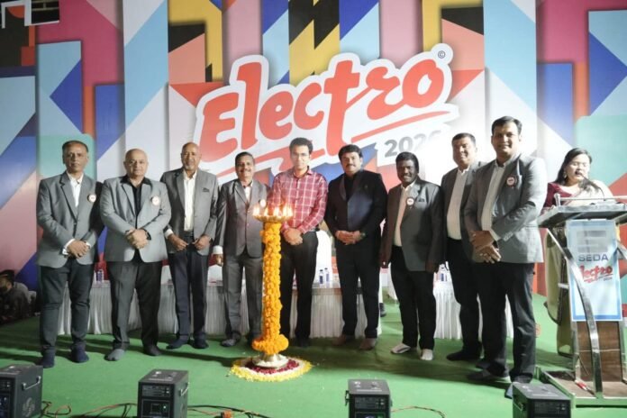 सोलापूर इलेक्ट्रॉनिक्स डिलर्स असोसिएशनतर्फे इलेक्ट्रॉनिक्स, कॉम्प्युटर्स, टेलिकम्युनिकेशन, होम अप्लायन्सेस, सोलर व फिटनेस इक्विपमेंट्सचे भव्य ‘इलेक्ट्रो 2026’ प्रदर्शन होम मैदानावर दि. 12 ते 18 फेब्रुवारी दरम्यान आयोजित करण्यात आले आहे. या प्रदर्शनाचे उद्घाटन व्ही प्लस कंपनीचे सीईओ श्री. संदीप पाटील यांच्या हस्ते व महापालिका आयुक्त डॉ. सचिन ओंबासे यांच्या प्रमुख उपस्थितीत पार पडले.